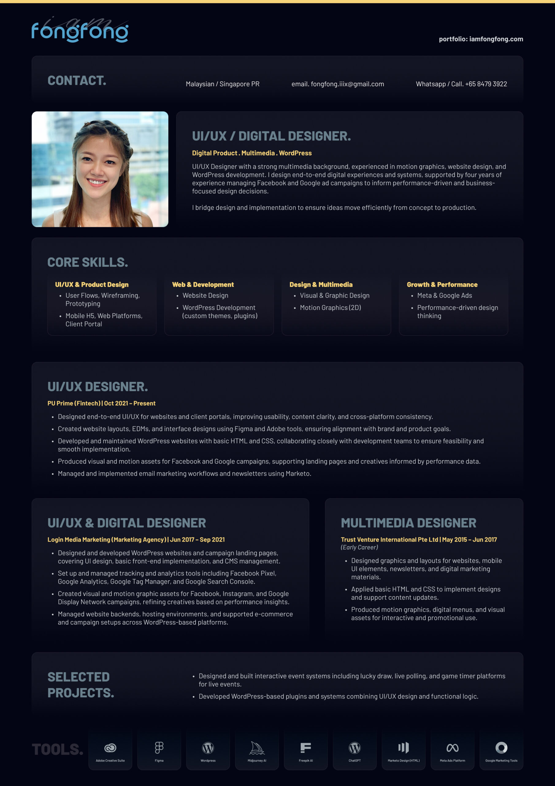 Hi, iamfongfong, a Singapore-based multimedia designer. I specialize in creating visually compelling Graphic design, WordPress websites, social media visuals, motion graphics, and running digital ads on Meta and Google platforms. With years of experience, I help brands build a consistent visual identity online.